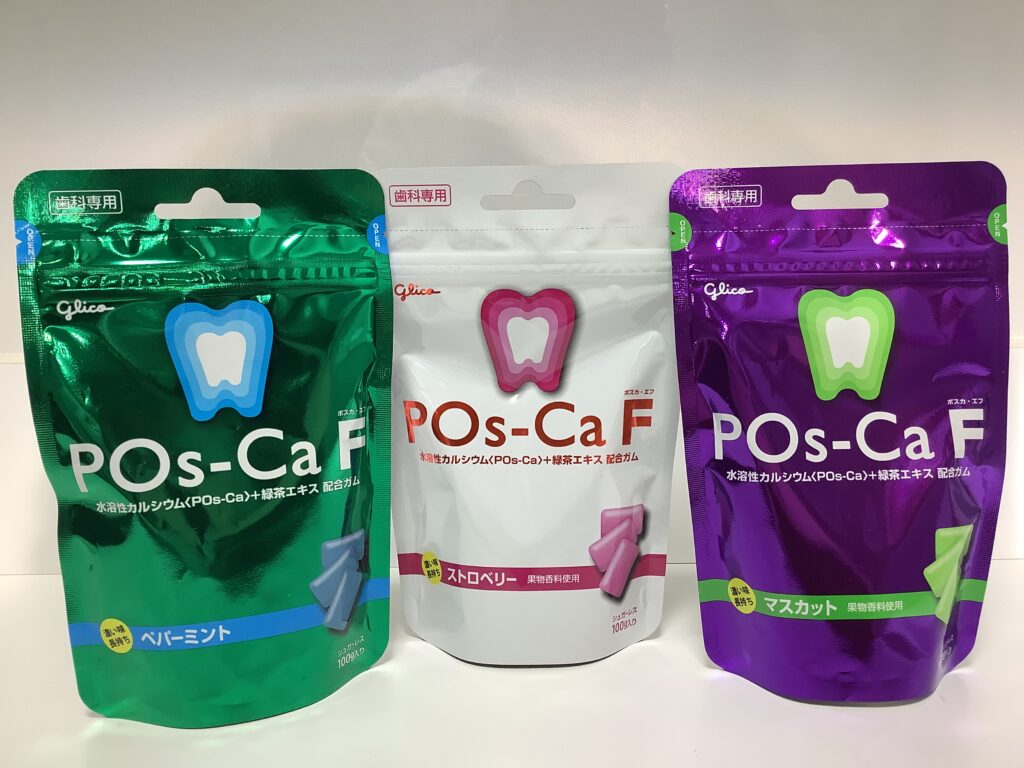 POs-Ca F(ポスカ・エフ) このガムには、水溶性カルシウムとフッ素が配合されています。 噛むことで唾液中のカルシウム濃度を高め、歯の表面の細かい傷や初期虫歯を修復する働き(再石灰化)を強力にサポートします。